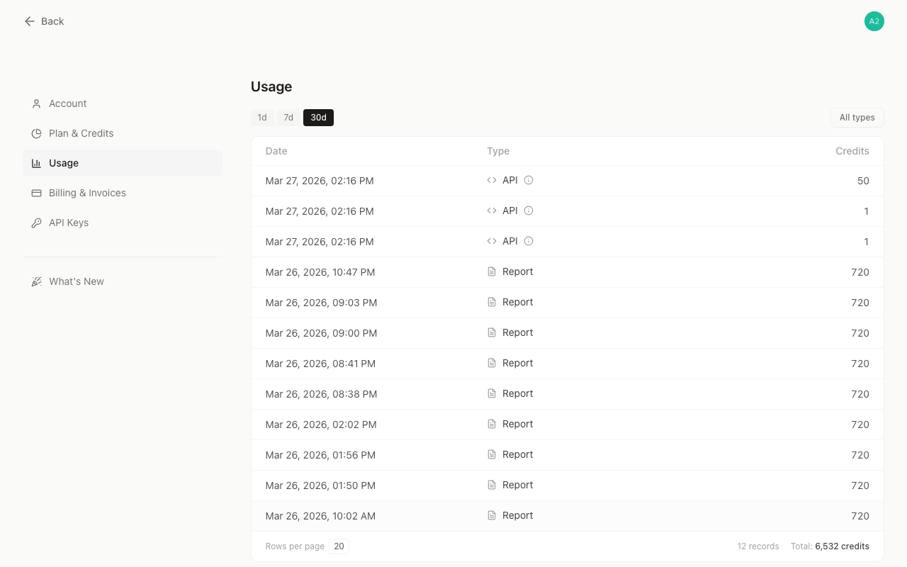 • Credits — how many credits the operation consumed, formatted to two decimal places