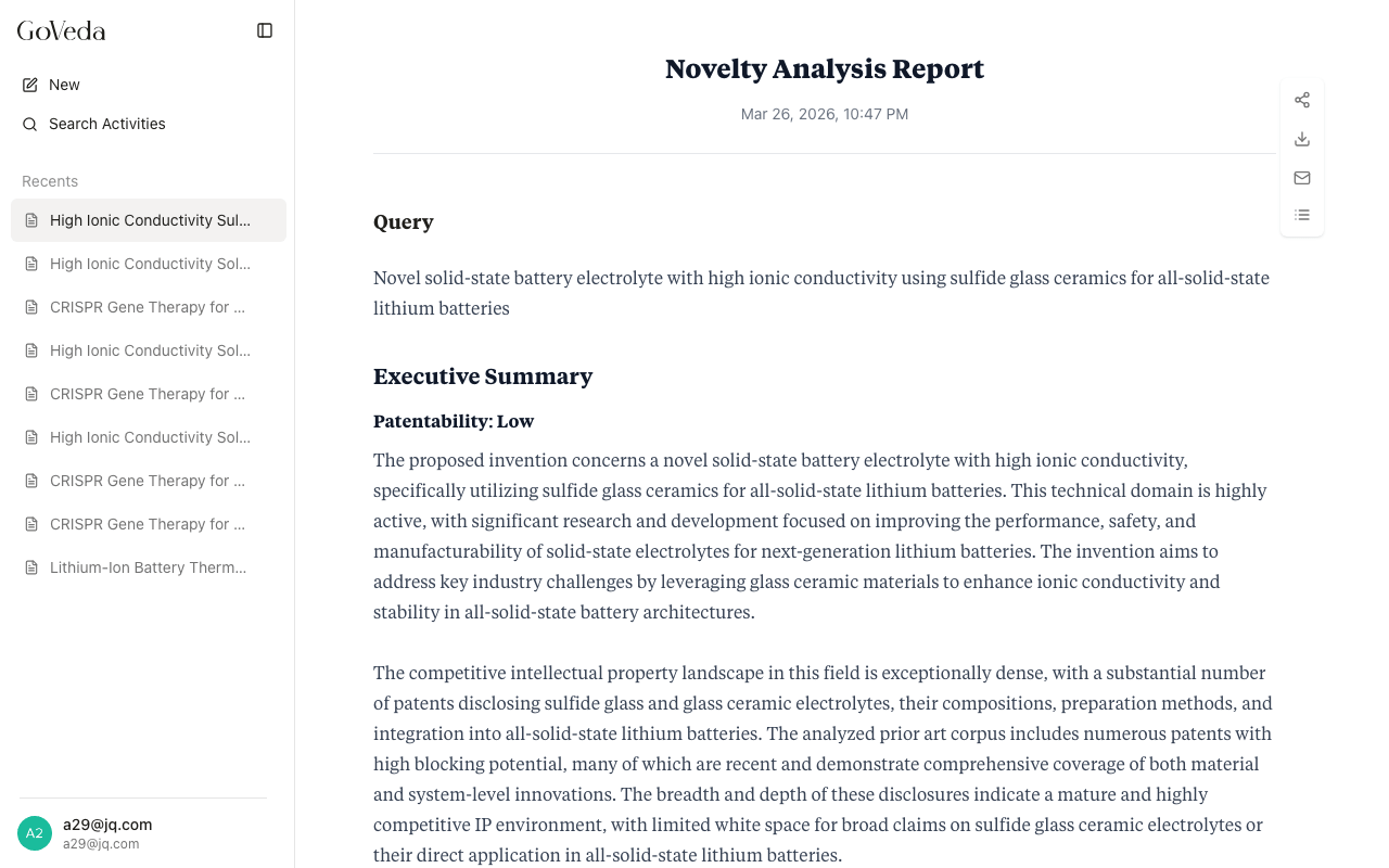 GoVeda reports are AI-generated patent analysis documents. Submit a description of your invention, and GoVeda searches global patent databases, compares your invention against prior art, and produces a structured written analysis.