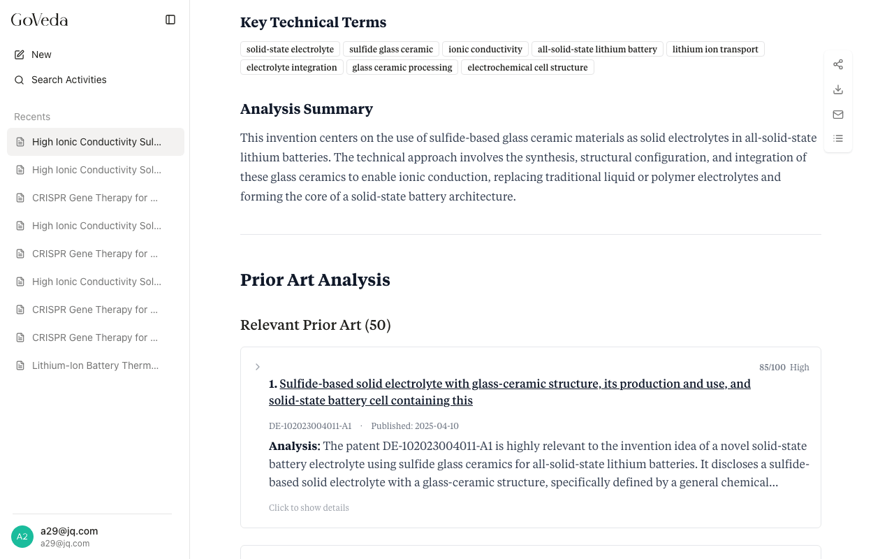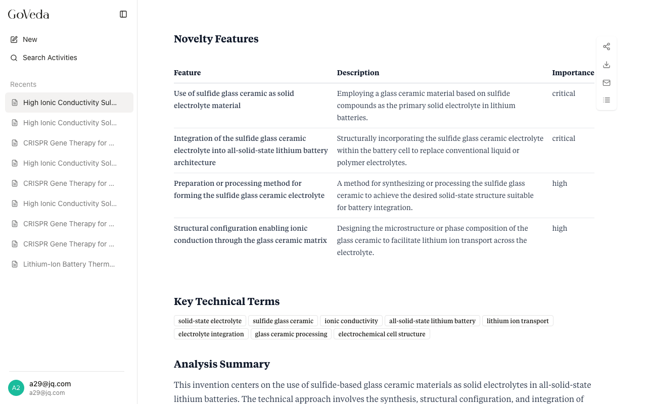 | Analysis Summary | A paragraph summarizing how GoVeda interpreted the invention before searching |