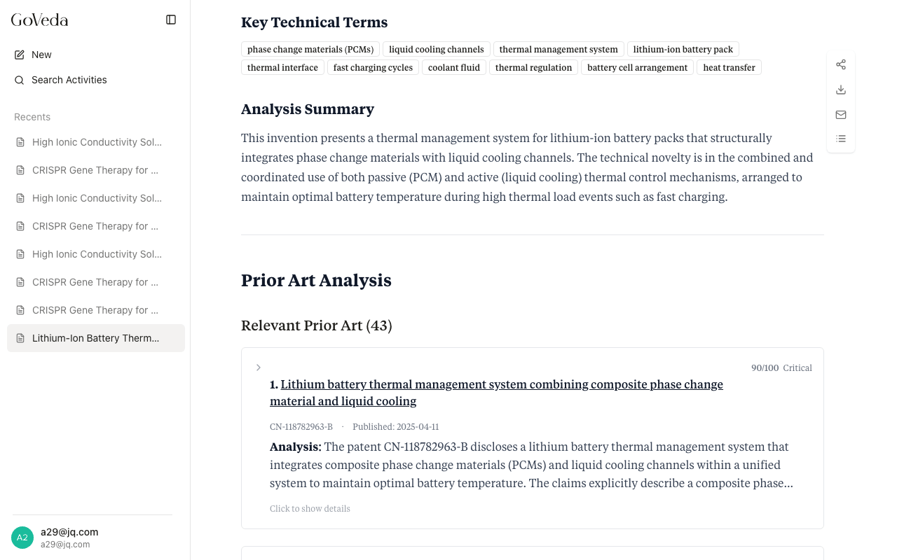 Then expand a few patent cards in the Prior Art Analysis. Click a card header to expand it and read the Relevant Excerpts, Technical Overlaps, Key Differences, and Novelty Feature Analysis. This per-patent breakdown is what distinguishes a GoVeda report from a simple patent search.