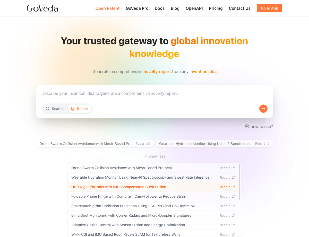 Sample reports are pre-generated, fully unlocked Novelty Analysis Reports on real invention topics. They are available to everyone with no login or subscription required. Reading through a sample is the fastest way to understand what a GoVeda report contains before you generate your own.