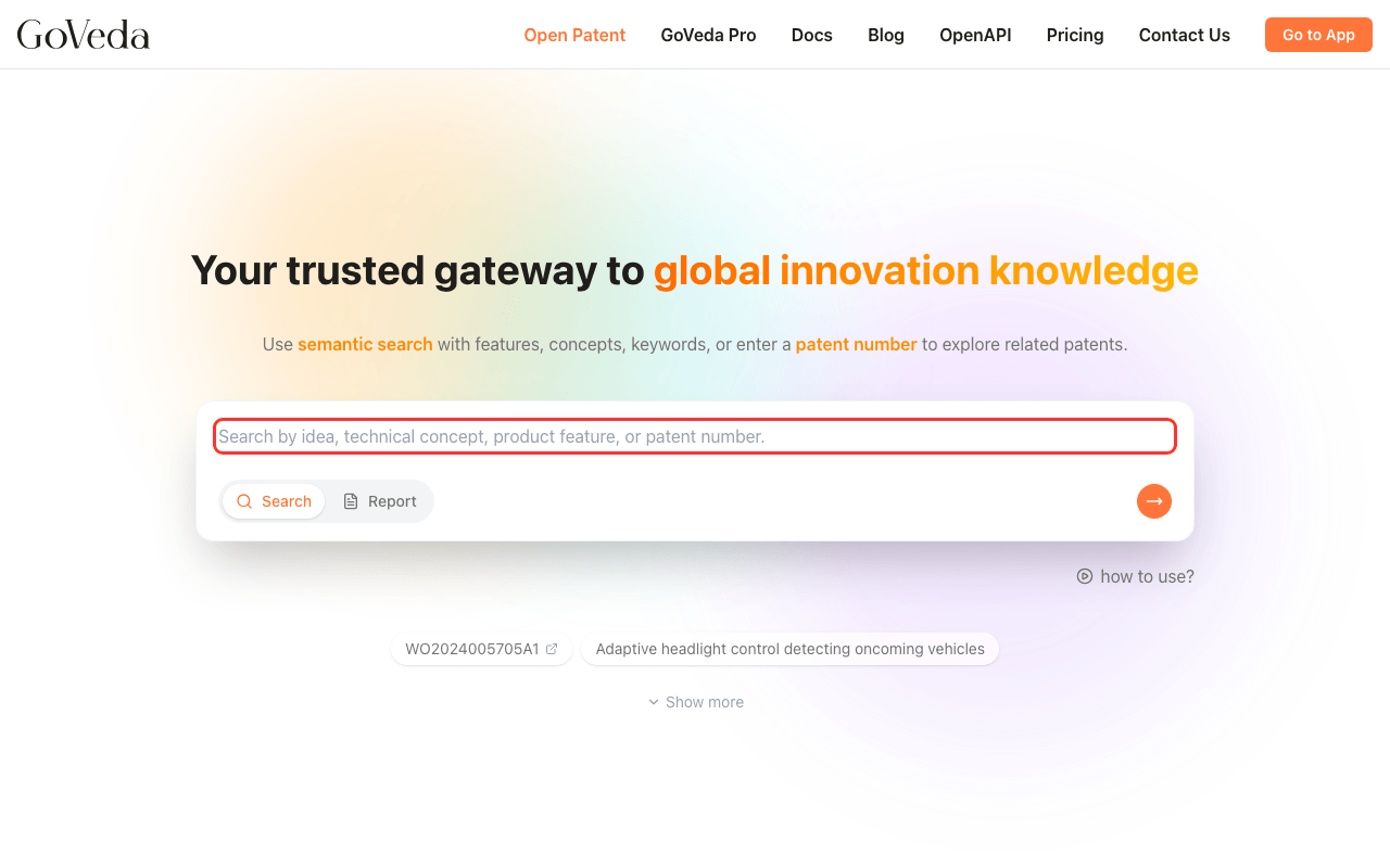 GoVeda gives you two ways to find patents: semantic search and patent number lookup. Both are available from the search bar on the home page.