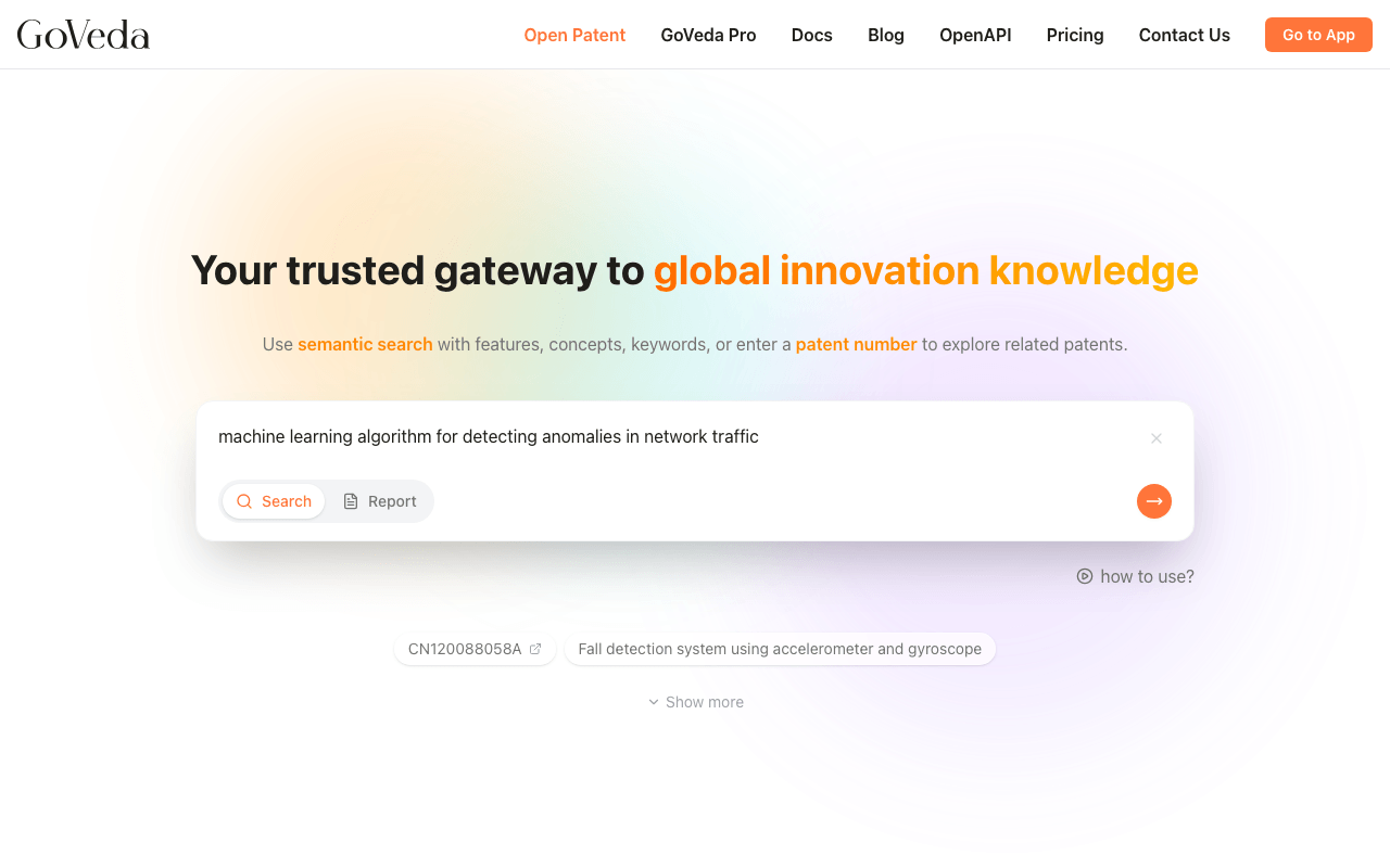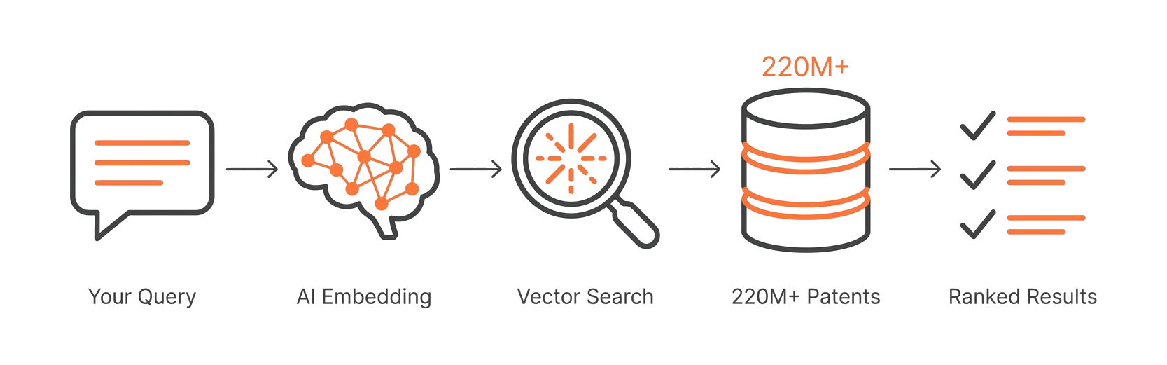 Semantic search lets you describe a technology or invention in your own words. Instead of matching exact keywords, GoVeda’s AI converts your query into a mathematical representation of its meaning, then finds patents whose content is conceptually similar. A patent about “wireless charging via inductive coupling” will surface when you search for “transferring power without a cable”, even if those exact words never appear in the patent.